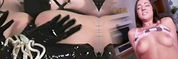 Kinky latex mistresses examine pussy of one plum girl outdoor